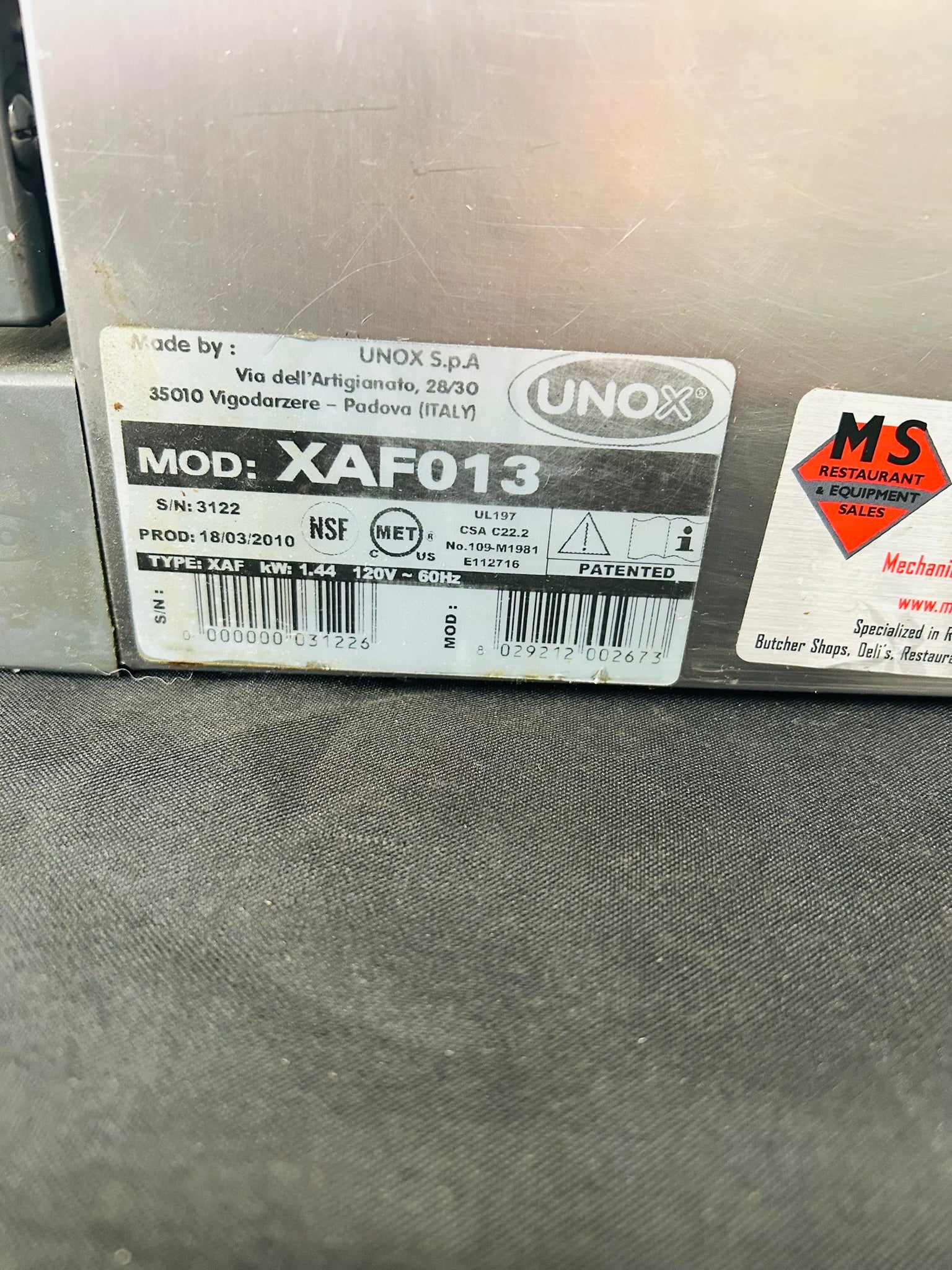 • NSF; MET to UL & CSA Standards / listed by UNOX S.r.l.