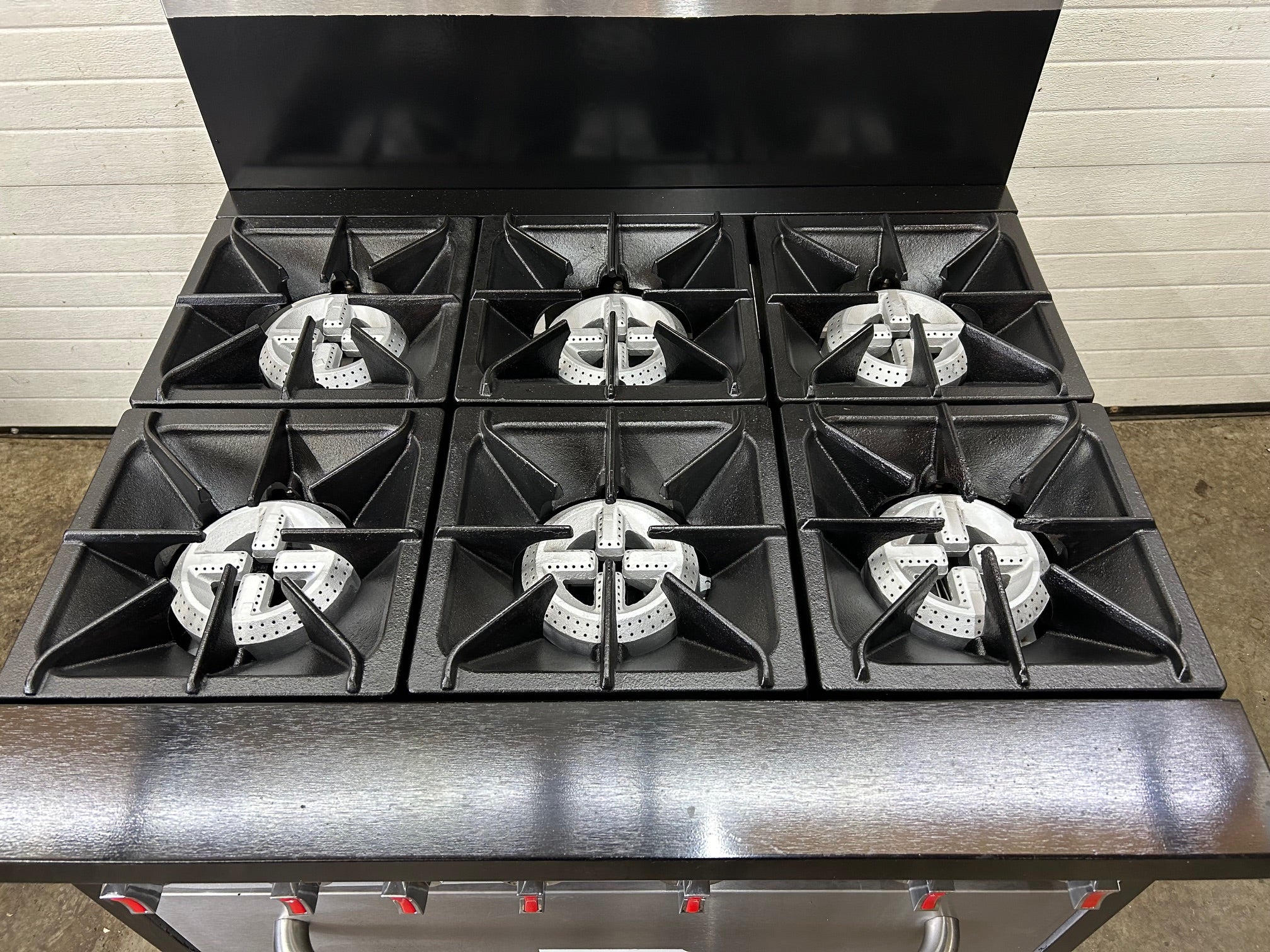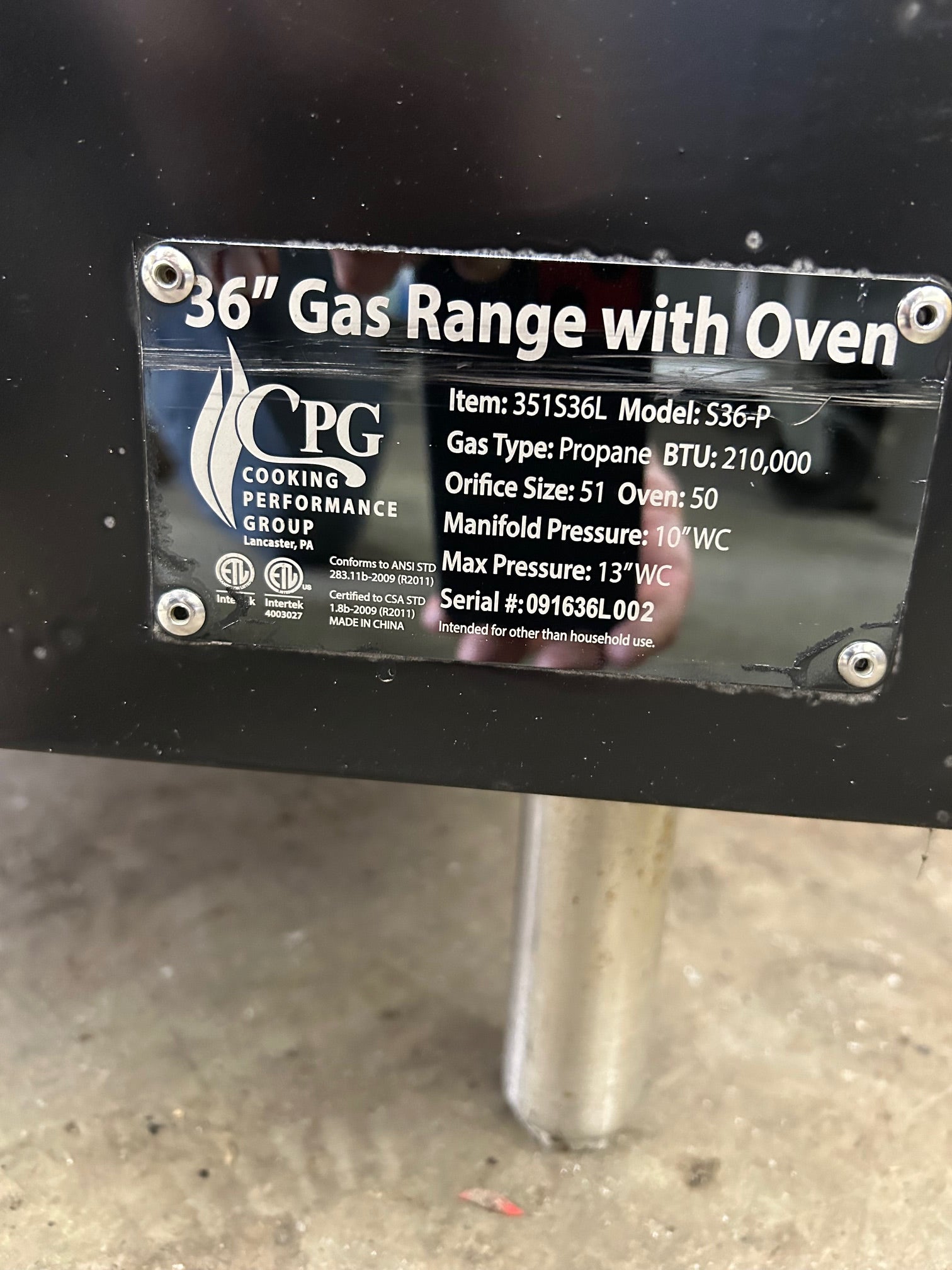 Boost your kitchen's efficiency, reliability, and overall performance with this Cooking Performance Group S36-P gas range! This propane range boasts (6) 30,000 BTU open top burners to deliver the impressive cooking performance you demand. The independently-controlled burners mean you can simultaneously execute a wide variety of tasks while their 12" x 12" heavy-duty cast iron grates support your sauce pans, fry pans, and other cookware. These rugged grates allow you to confidently boil, saute, and simmer as needed while effortlessly sliding even the heaviest stock pots from one burner to another. A 4 1/2" plate rail gives you a bit of extra room to work with and combines with a 9 1/2" deep back shelf that holds go-to seasonings and supplies to maximize your cooktop efficiency.
