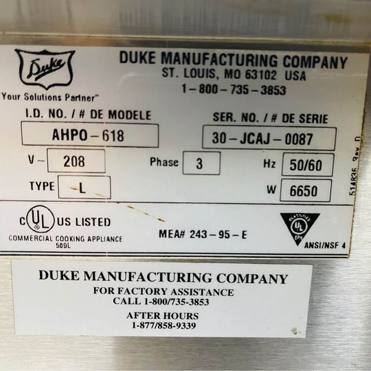 DUKE AHPO-618, PROOFER/CONVECTION OVEN Tested & Working!