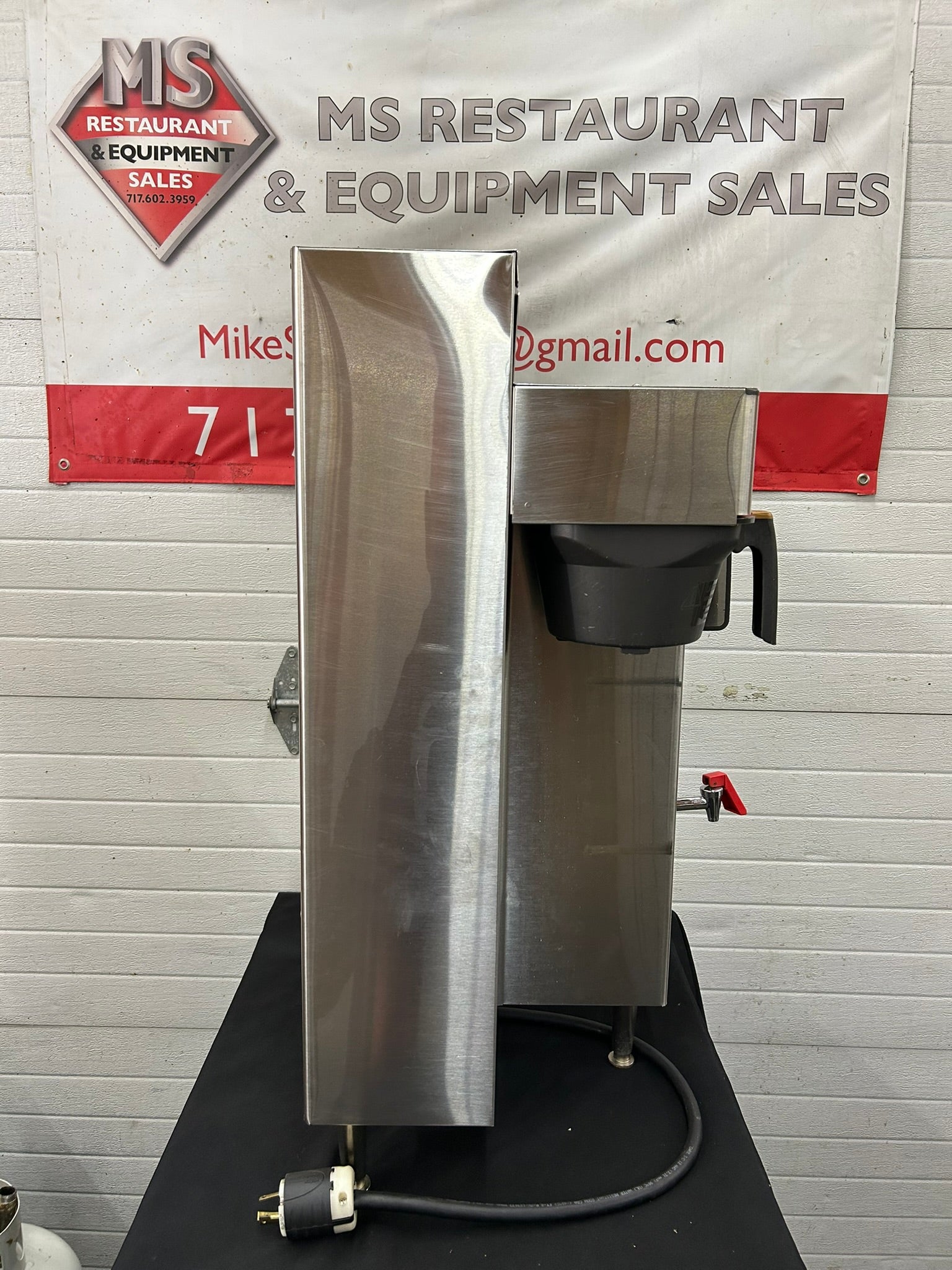 Made for high volume use in places like convenience stores, specialty coffee shops, or office coffee stations, this model brews up to 14 gallons per hour. It has a sleek stainless steel exterior that is great for front of the house areas like behind counters. It requires a 240V electrical connection and has an output of 4200-6100W.