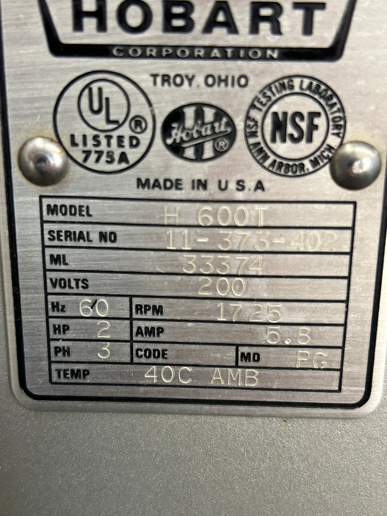 Hobart H600 T 200V/60Hz/3 Ph