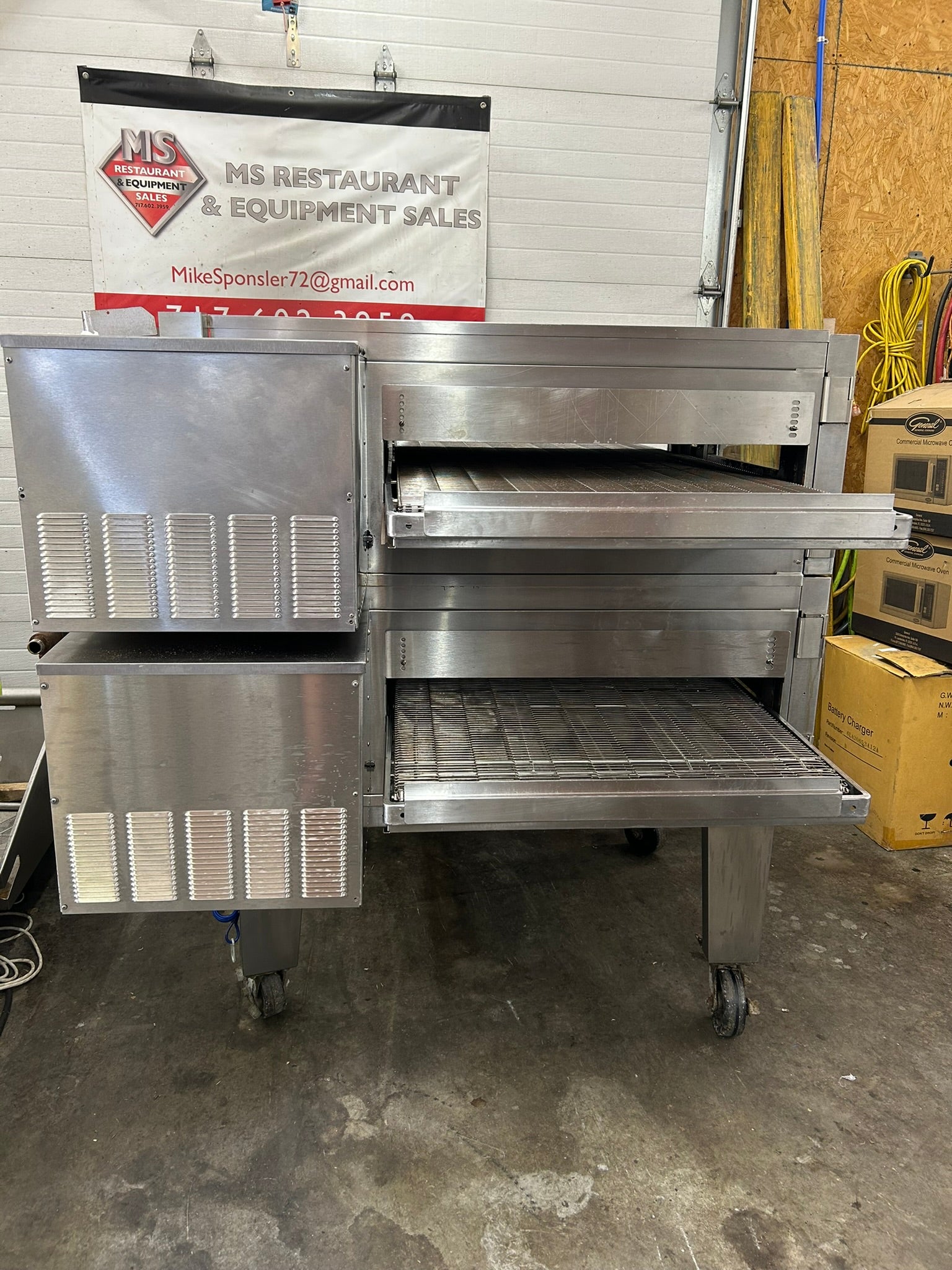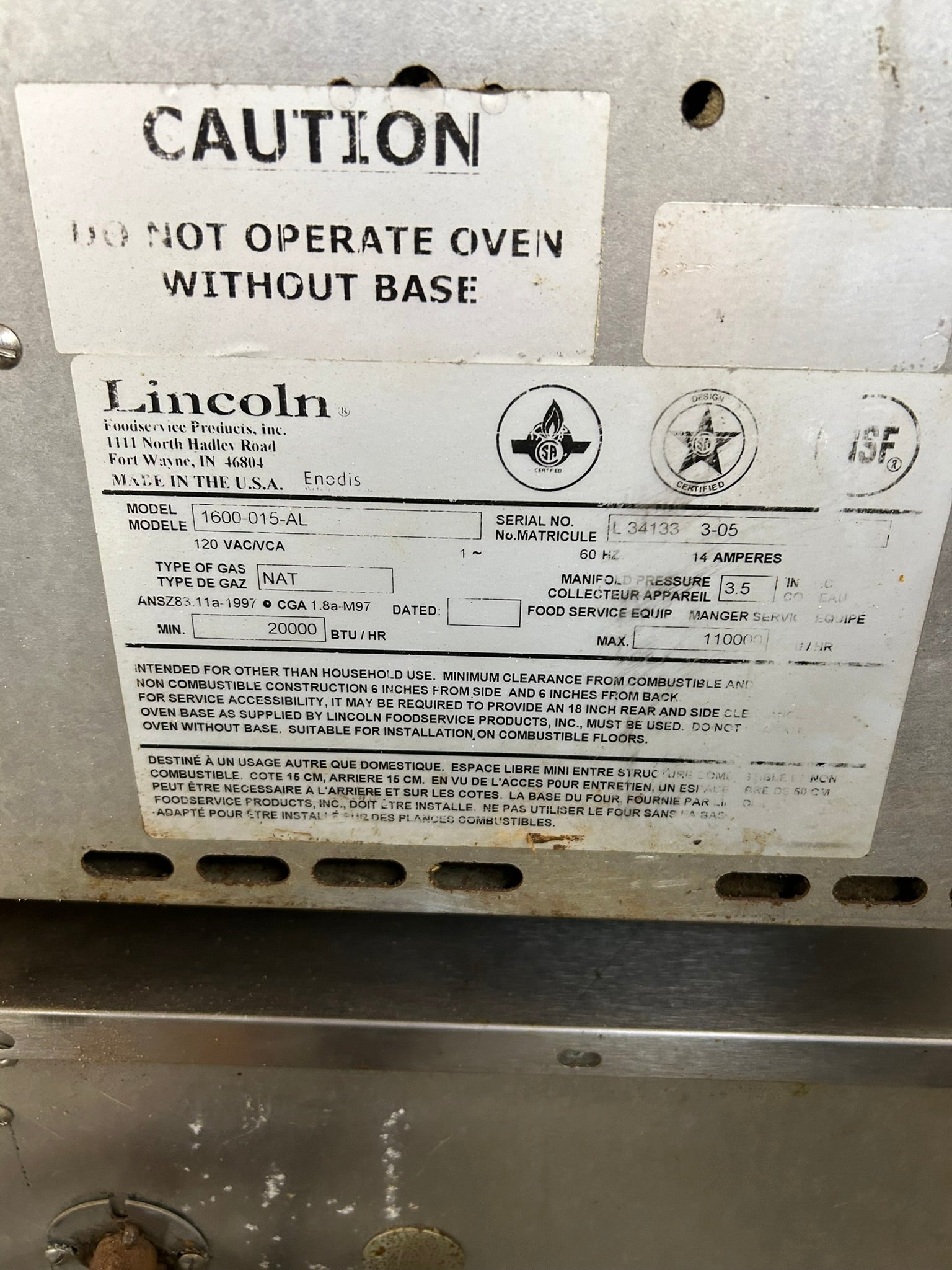 Lincoln Impinger 1600 Double Stack 32 inch Conveyor Pizza Oven, Natural Gas. 20,000 BTU/HR. MAX 110,000 BTU/HR. 120/60/1. 14 Amps