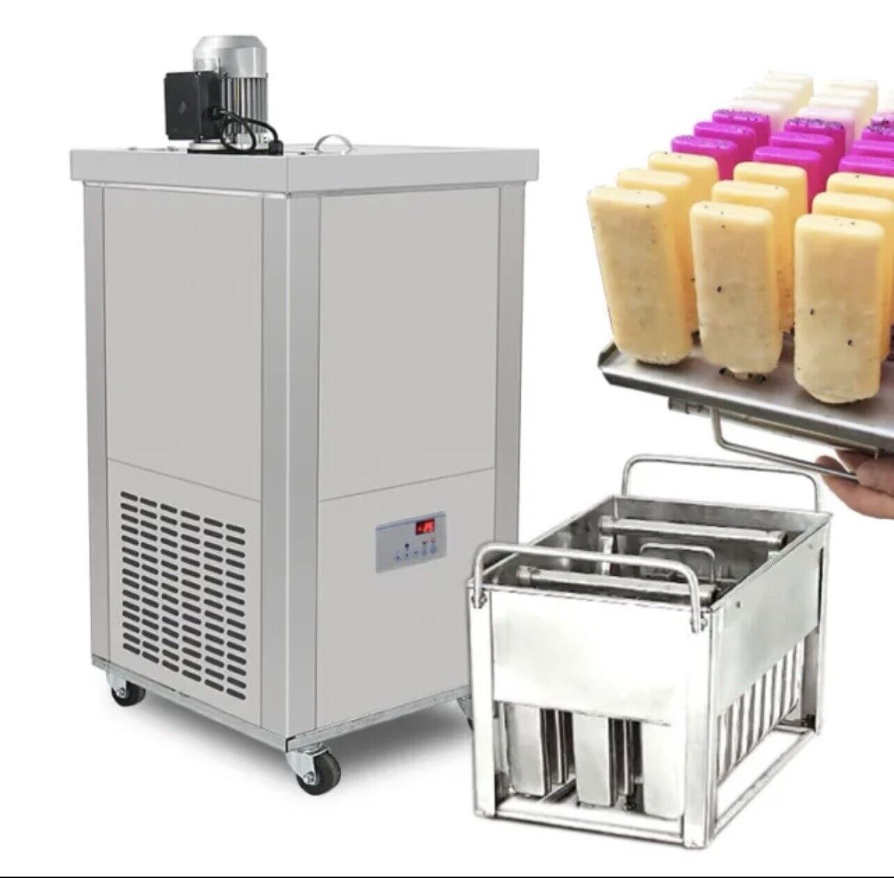MAIN FEATURES】:It is single mold set ice popsicle machine with quality compressor, made under 110V 60HZ, 1200W with US plug , production capacity: about 120-160pcs/hour, #304 stainless steel brine tank equipped with outlet of drain pipe, rotator inside brine tank make the freezing rate become more efficient, Dimensions : 17.52"x22.44"x48.82", 4 wheel castors with brake, one stainless steel funnel come with machine. Machine equipped with commercial powerful motor to lead the freezing flows inside the tank rotating quickly and make the popsicle frozen more quickly. And we adopt more copper tubes for our machine to make the freezing rate great.