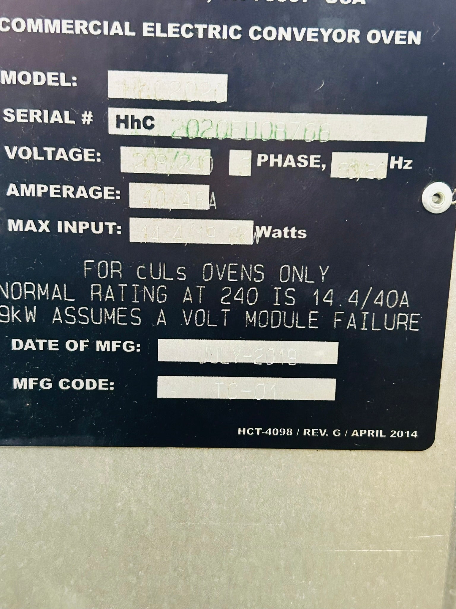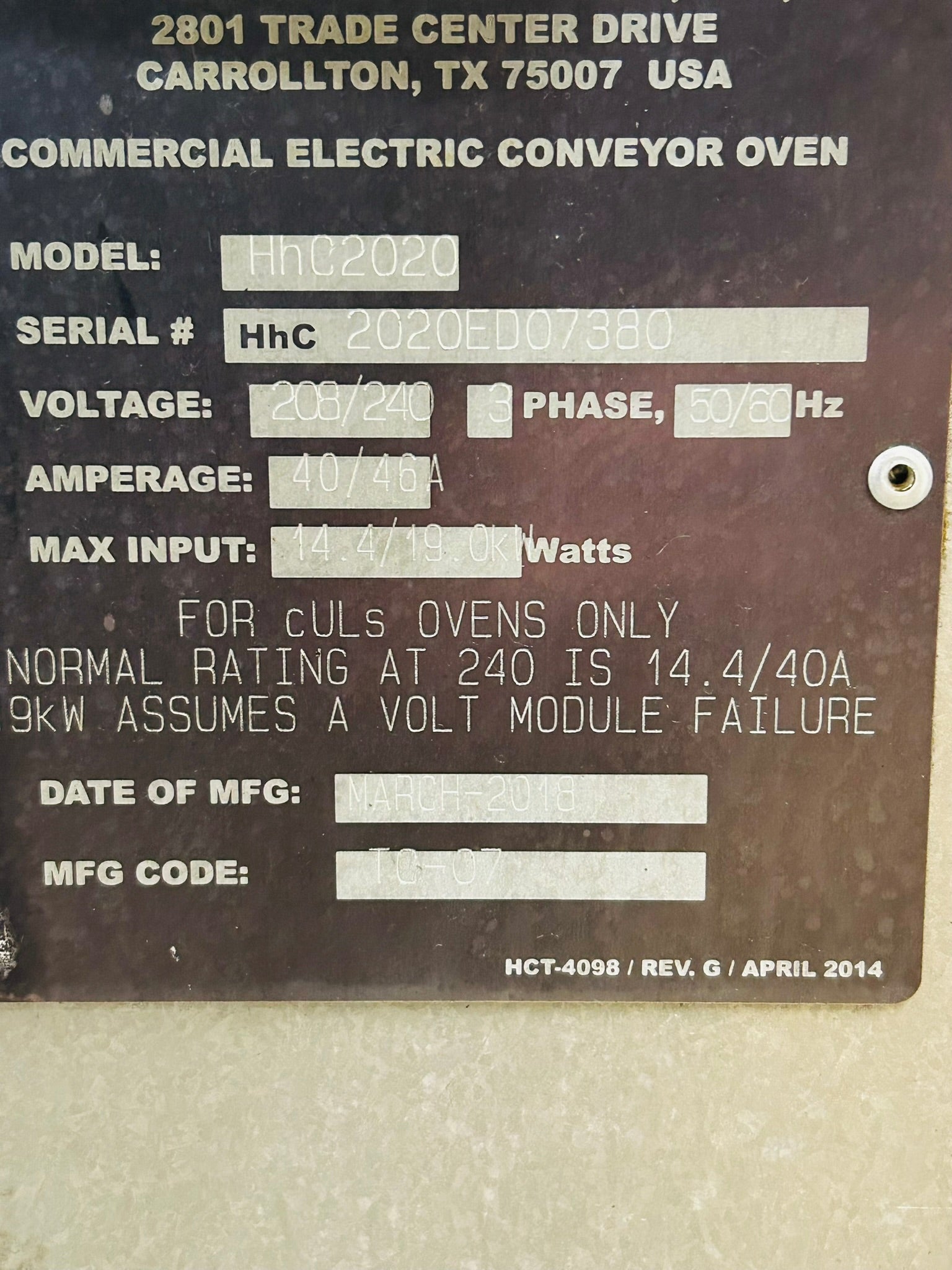 High h Conveyor 2020™ Conveyor Oven, Rapid Cook, electric, countertop, single deck, 20" wide belt, 20" cook chamber, variable speed motor, idle mode, built-in self diagnostics, smart voltage sensor technology, cool to touch covers and panels, stainless steel front, top, sides and back,stainless steel interior, cULus, CE, UL EPH Classified, ANSI/NSF 4, TUV (ventless), 208v/60/3ph